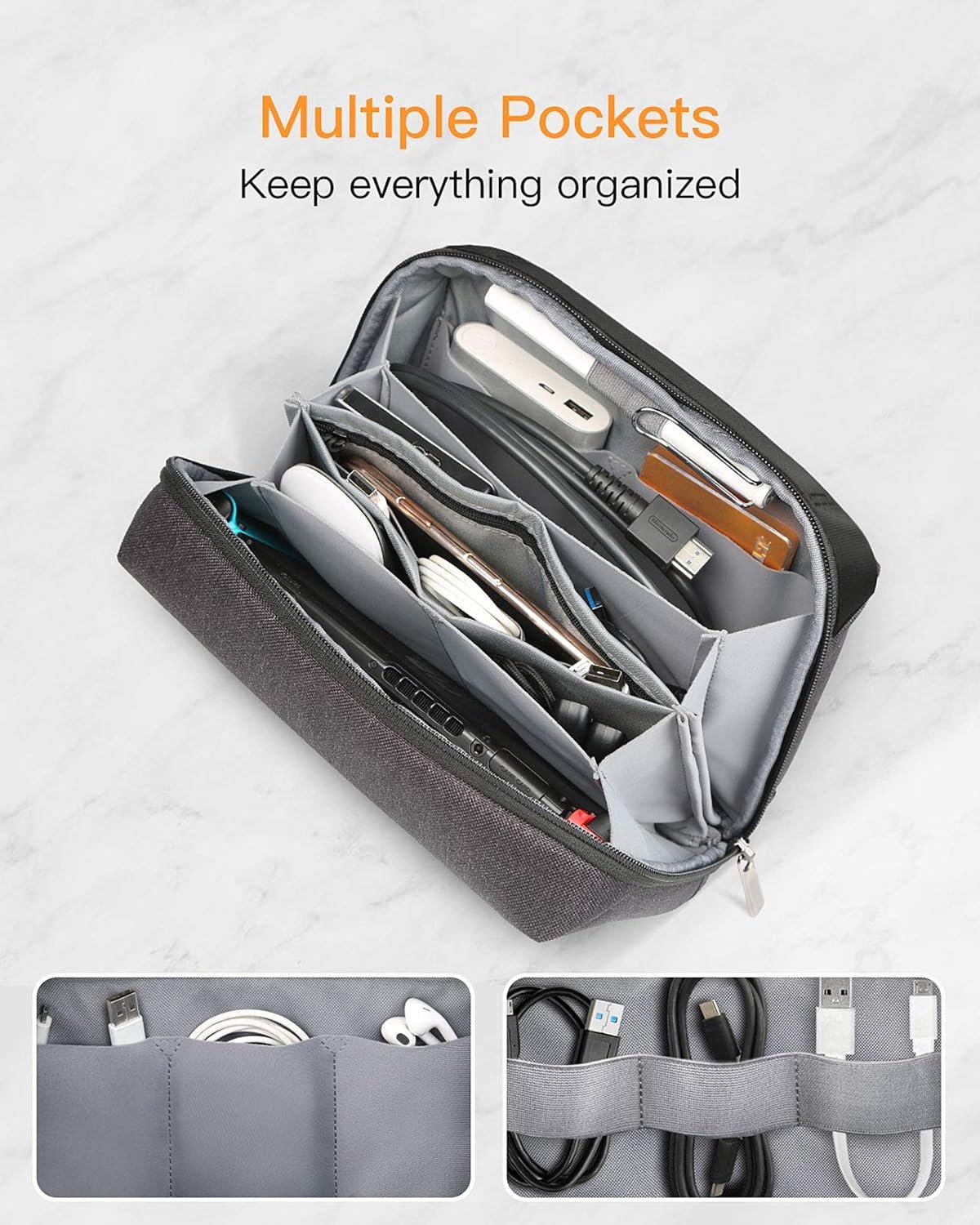 Well-Organized: There are 18 different compartments or pockets to store chargers, hard drives, USB cables, power bank, mouse, earphones, small notebooks, pens, etc