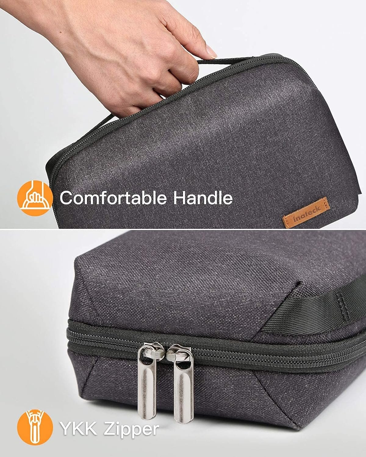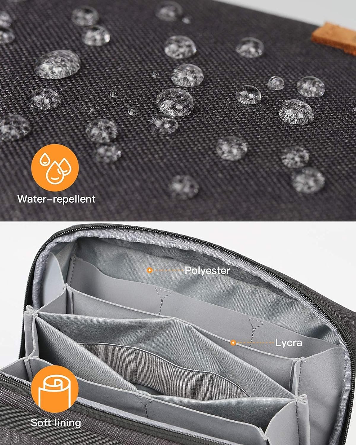 Electronics Organizer: The tech pouch is made of polyester materials.The double YKK zippers making the zipping smooth. The exterior 1200D polyester is water-repellent and weatherproof, and the interior layer is made of soft lycra to protect the items inside from collision and friction. The brown leather handle is durable and stylish