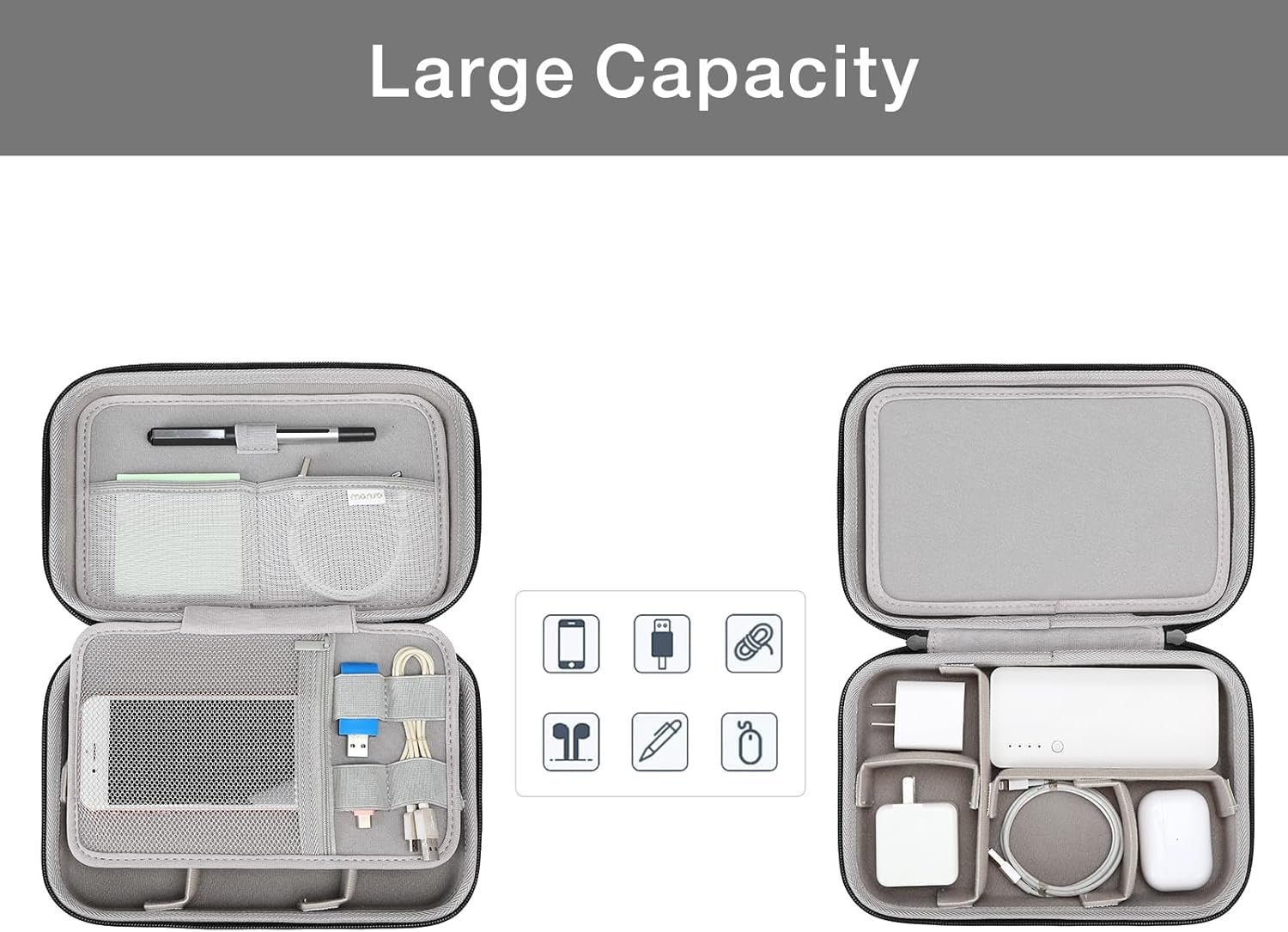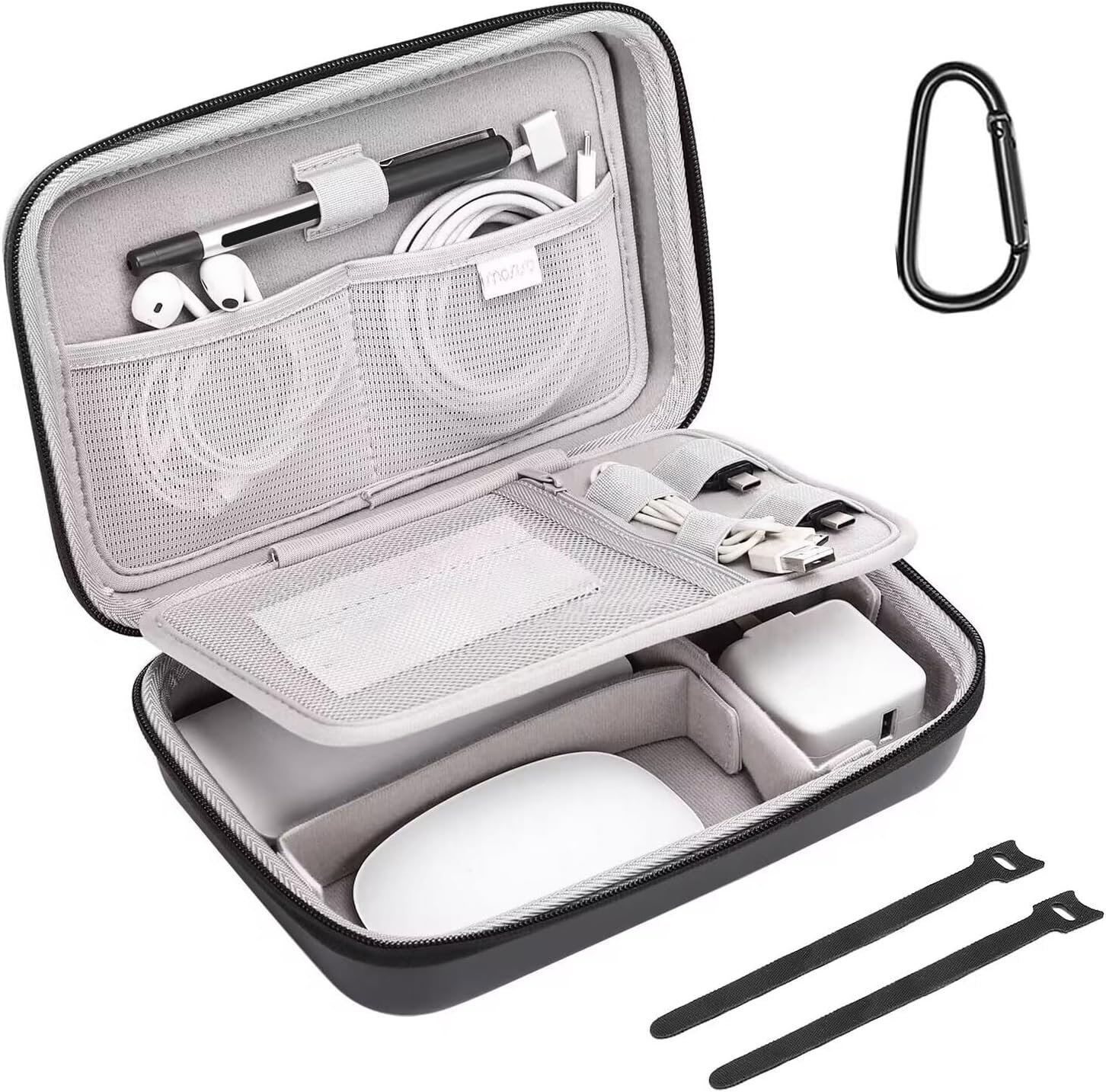 This multifunctional electronics carrying case storage bag is designed to be compatible with MacBook power adapter, compatible with Magic Mouse & Pencil, compatible with AirPods, SD card, cable, charge, power bank, USB flash disk and other accessories. Compact design with handle & snap hook which makes it easier to carry in backpack, suitcase, luggage or hanging around wrist.