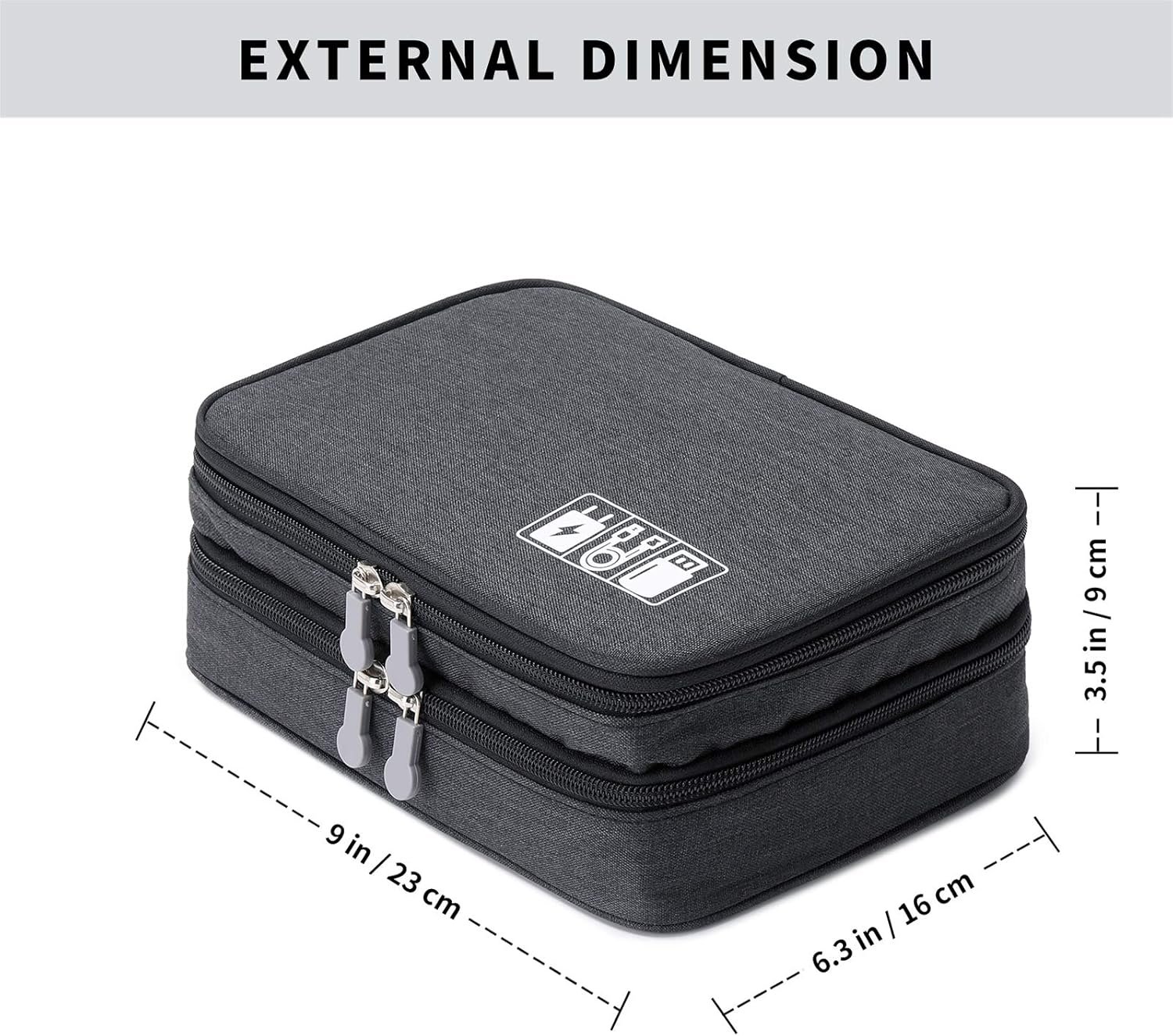 【COMPACT & PORTABLE】- Electronics storage bag Dimensions:9*6.3*3.5 inch(23*16*9 cm) , this cord organizer will be a perfect helper while you are on travel or business trip. Its perfect size allows it to be easily put into your backpack and luggage. And it is also very suitable for family use and daily organization.